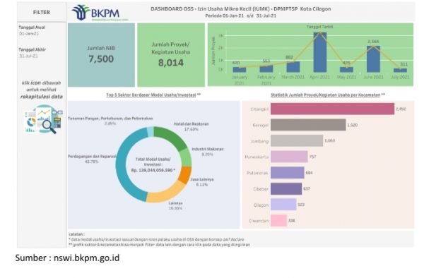 Di Kota Cilegon sendiri berdasarkan data rekapitulasi Izin Usaha Mikro Kecil (IUMK) yang sudah di proses pada Online Single Submission (OSS) pada tahun 2020 tercatat sebanyak 1.063 Nomor Induk Berusaha (NIB) terbit untuk IUMK dengan sebanyak 1.293 jumlah proyek / kegiatan usaha. dan hasil rekapitulasi tahun 2021 hingga triwulan II Izin Usaha Mikro Kecil mencatatkan pertumbuhan angka yang sangat signifikan, pada periode triwulan II tercatat 7.500 NIB terbit untuk IUMK dengan sebanyak 8.014 jumlah proyek / kegiatan usaha.