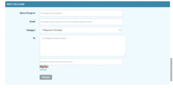 3. Pilih kolom Input Keluhan, Isi data diri berupa Nama Pengirim, Email, pilih Ketegori pengaduan kemudian Isi kolom keluhan dengan keluhan yang ingin disampaikan.
